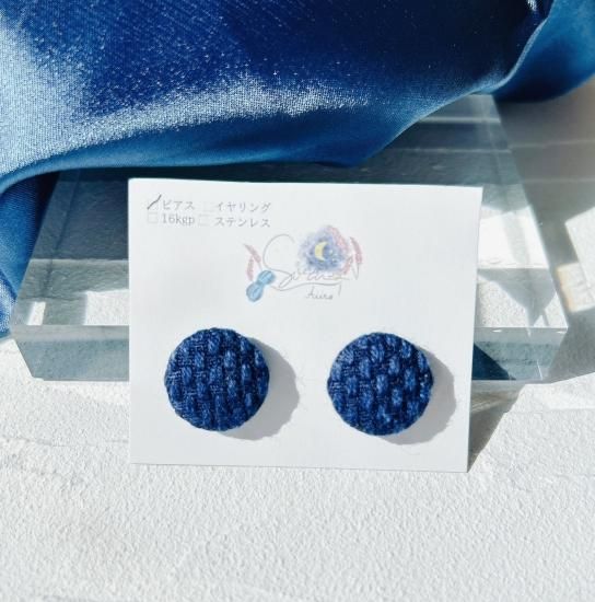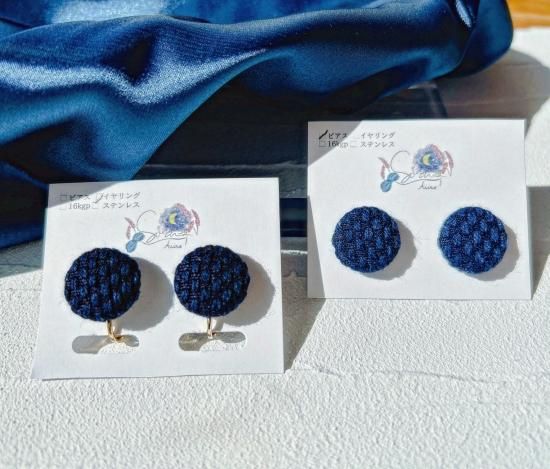 深い藍色で染色された生地をくるみボタンにして、アクセサリーにしています(*^^*)防具を作成する際に出てしまう、織刺の端材をリユースしております✨